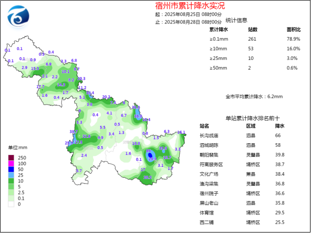 8月25日08时至28日08时,全市累计降水量大于10mm的站点53个(面积比:16.0%),降水量大于25mm的站点10个(面积比:3.0%),降水量大于50mm的站点2个(面积比:0.6%),最大泗县长沟戚庙66mm。全市平均降水量:6.2mm,各县区平均降水量:砀山县2.7mm、萧县5.2mm、埇桥区8.3mm、灵璧县5.5mm、泗县7.9mm。